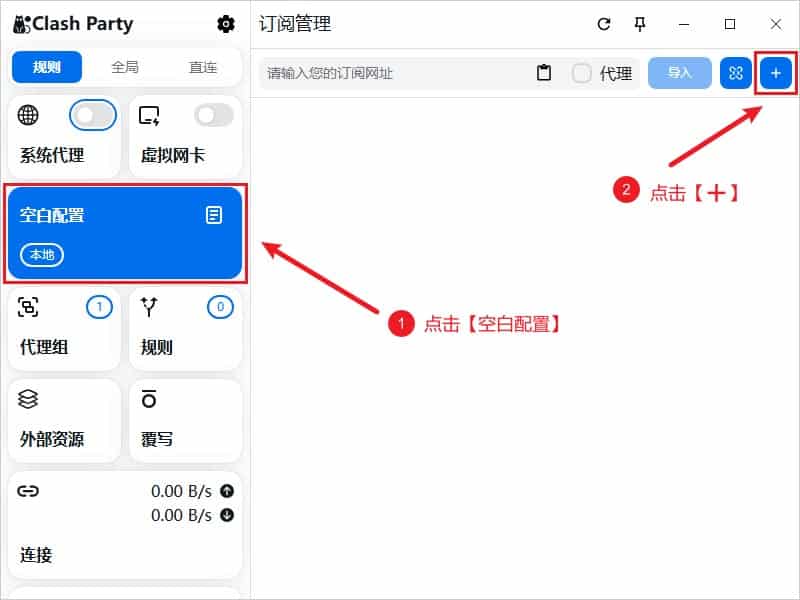 然后点击界面左侧菜单空白配置,在顶部输入框填入刚才复制的 URL 连接地址并点击导入即可,下载完成后点击对应的配置文件即可添加配置文件,如下图所示。